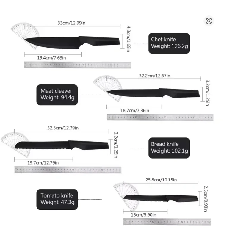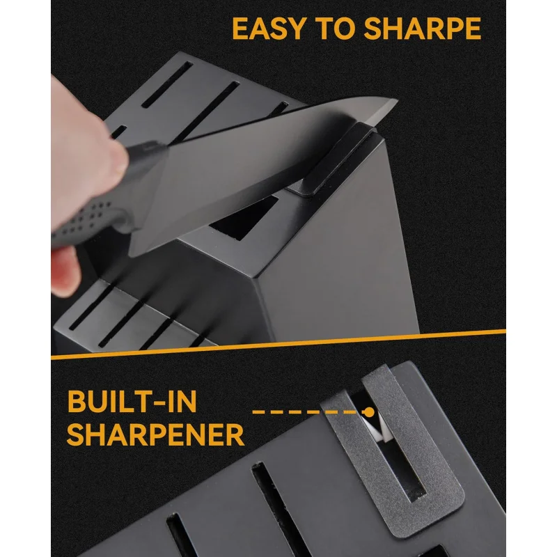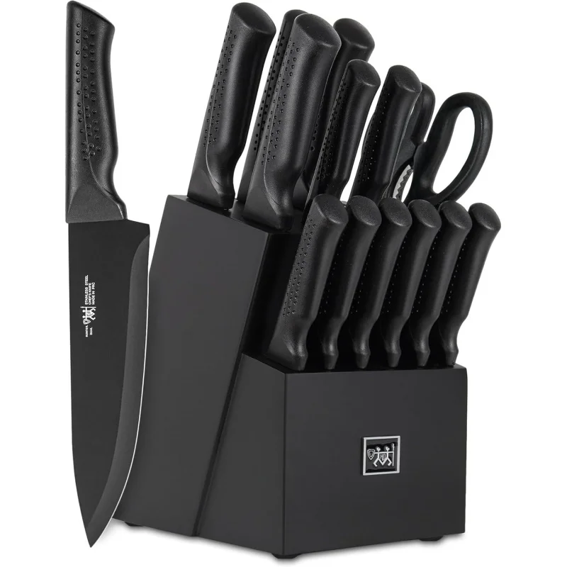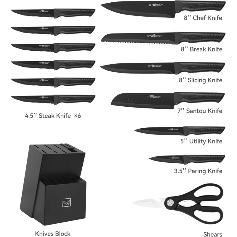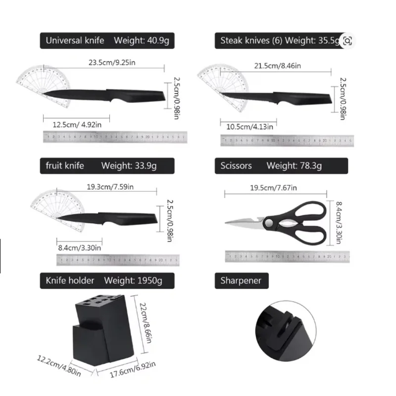 This 15-piece knife set is perfect for all your kitchen cutting tasks. It includes 6 steak knives, chef knives, and utility knives for versatile use. The set comes with a self-sharpening block to maintain sharp edges. Made from high-quality stainless steel for durability and rust resistance. Dishwasher-safe design ensures easy cleaning and maintenance. Ergonomic, anti-slip handles provide safety and comfort during use. The knife block keeps all pieces organized and easily accessible. Ideal for home kitchens, professional chefs, and culinary enthusiasts. Sharp blades make slicing, dicing, and chopping effortless. Sleek black design adds a modern touch to your countertop. Perfect for preparing meats, vegetables, fruits, and baked goods. This knife set combines convenience, durability, and professional performance for everyday cooking.