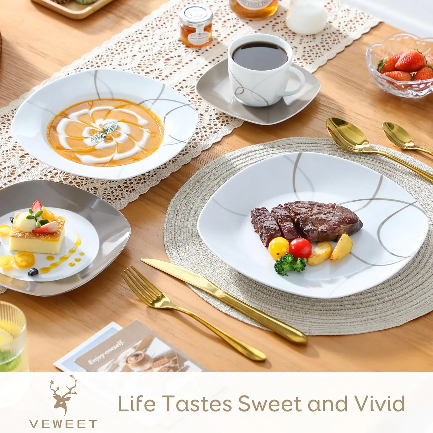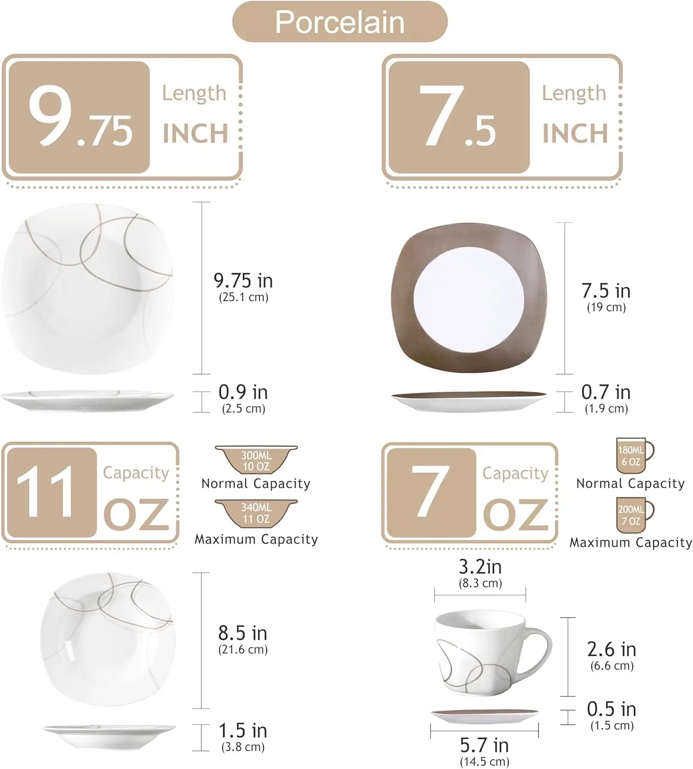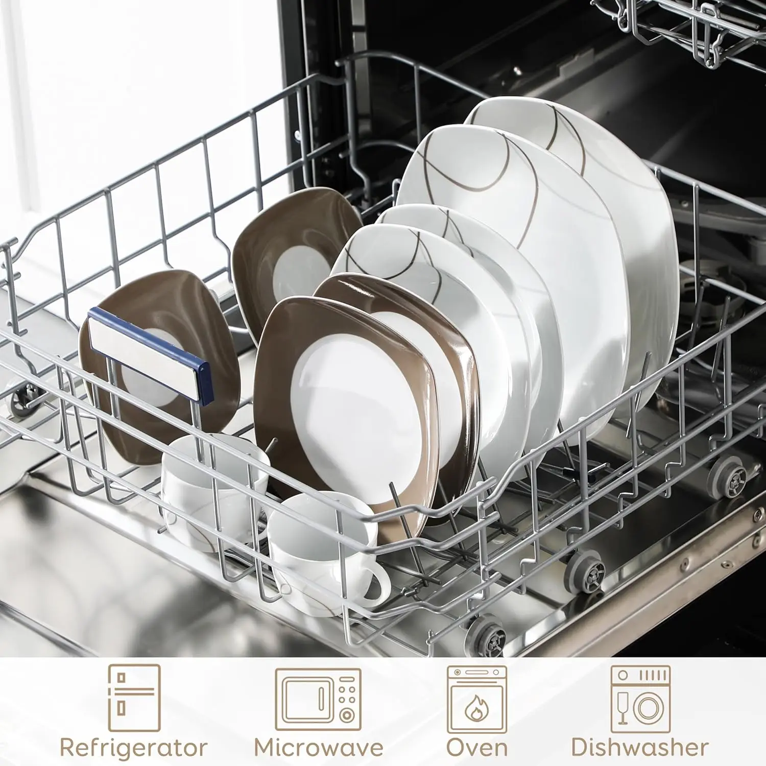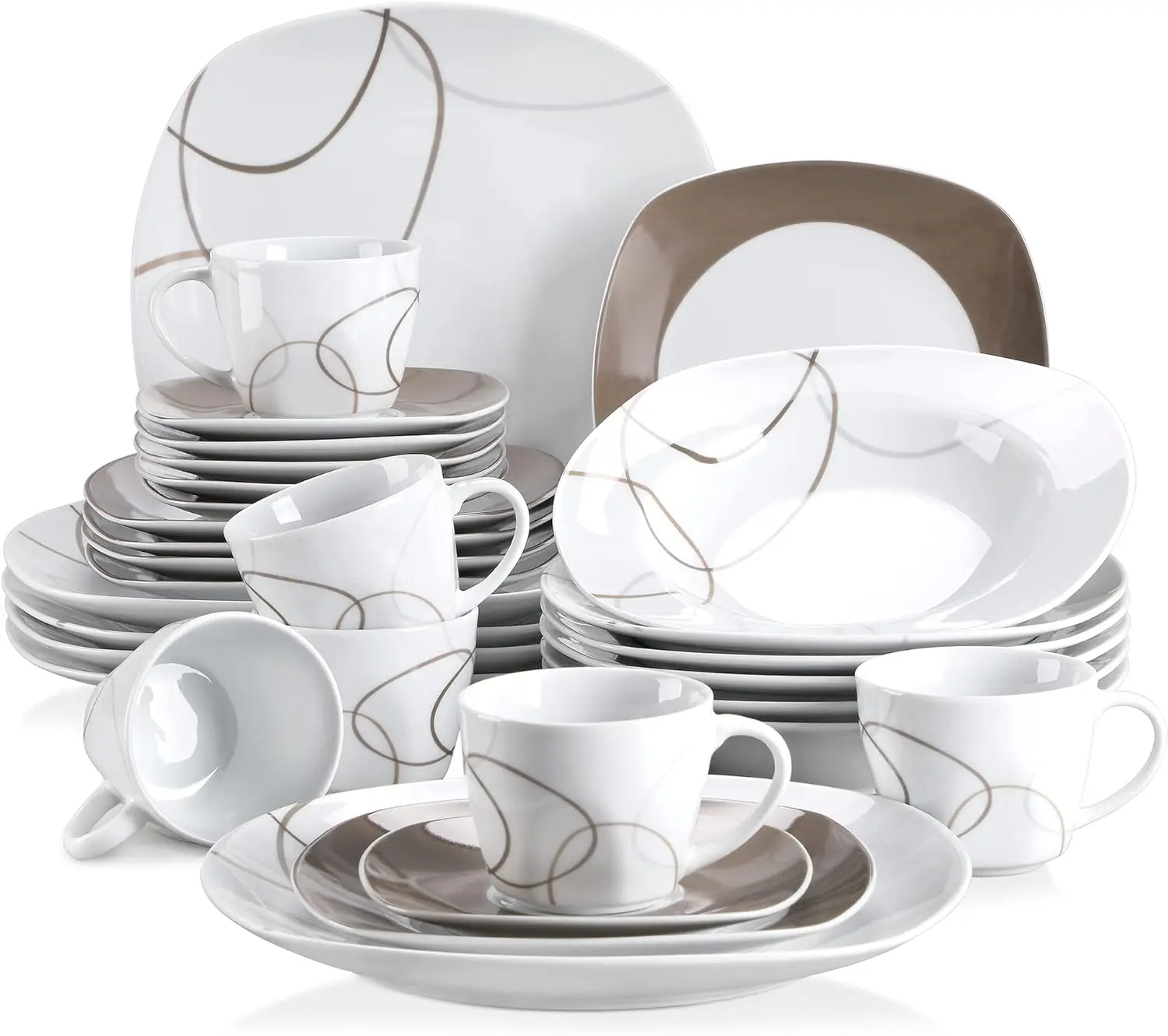 This 30-piece ivory porcelain dinner set combines elegance and practicality for every dining occasion. The set includes dinner plates, soup plates, and dessert plates. Each piece features subtle brown line accents for a sophisticated look. Crafted from durable porcelain, the dishes are long-lasting and sturdy. The smooth surface is easy to clean and maintain. The neutral ivory color complements a wide range of table settings. It is microwave safe, allowing for convenient reheating of meals. The set is perfect for family dinners, casual meals, or formal gatherings. Each piece is designed for comfortable handling and serving. The set stacks neatly to save cabinet space. Its classic design enhances the presentation of any meal. This dinnerware collection blends functionality, style, and elegance seamlessly.