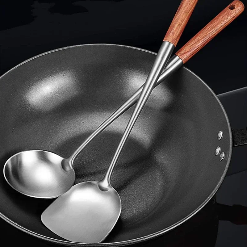 This stainless steel utensil set is designed for everyday cooking. Each piece is crafted from high-quality 304 steel for reliable durability. The set includes essential tools like a wok spatula, rice spoon, and slotted turner. Its smooth finish gives each utensil a clean and modern look. The handles are comfortable to hold for easy cooking. These utensils are resistant to heat and corrosion. They work well with a wide range of cookware. The sturdy build ensures long-term use in busy kitchens. Each tool cleans easily after cooking. The set offers a balanced mix of function and style. It is suitable for home cooks or professional kitchens. This utensil set helps make meal preparation faster and more convenient.