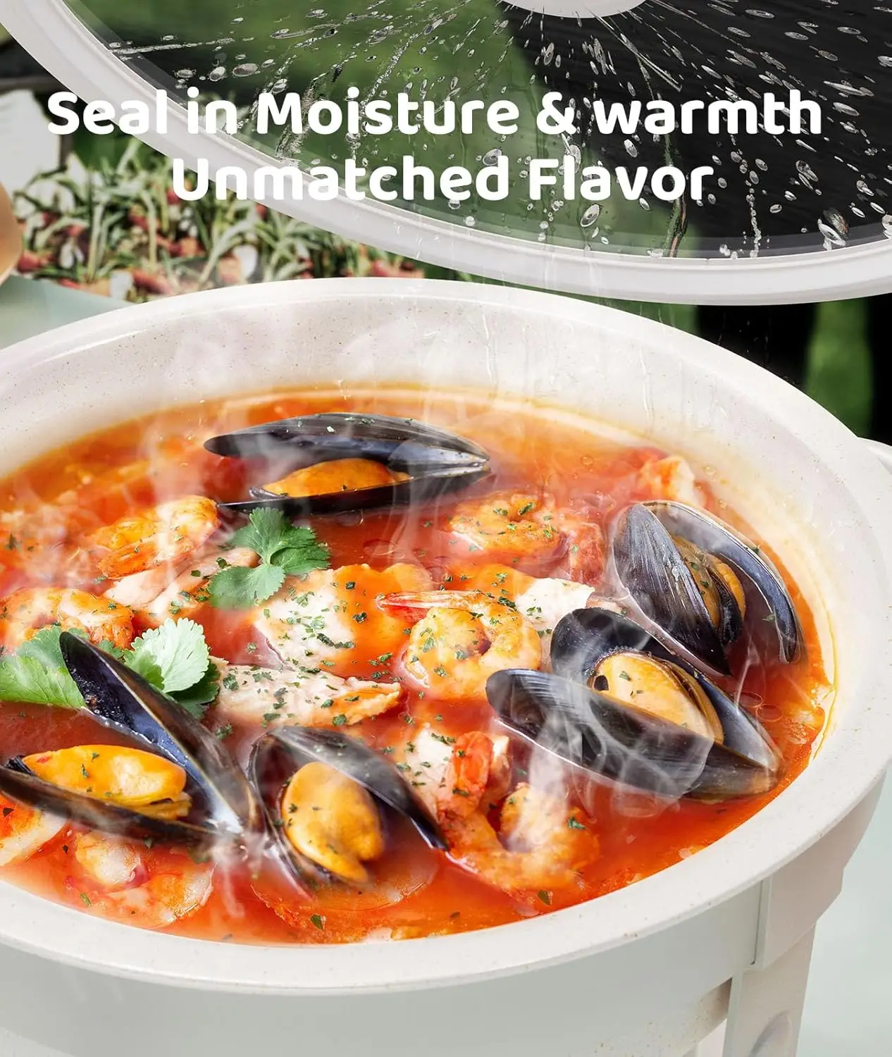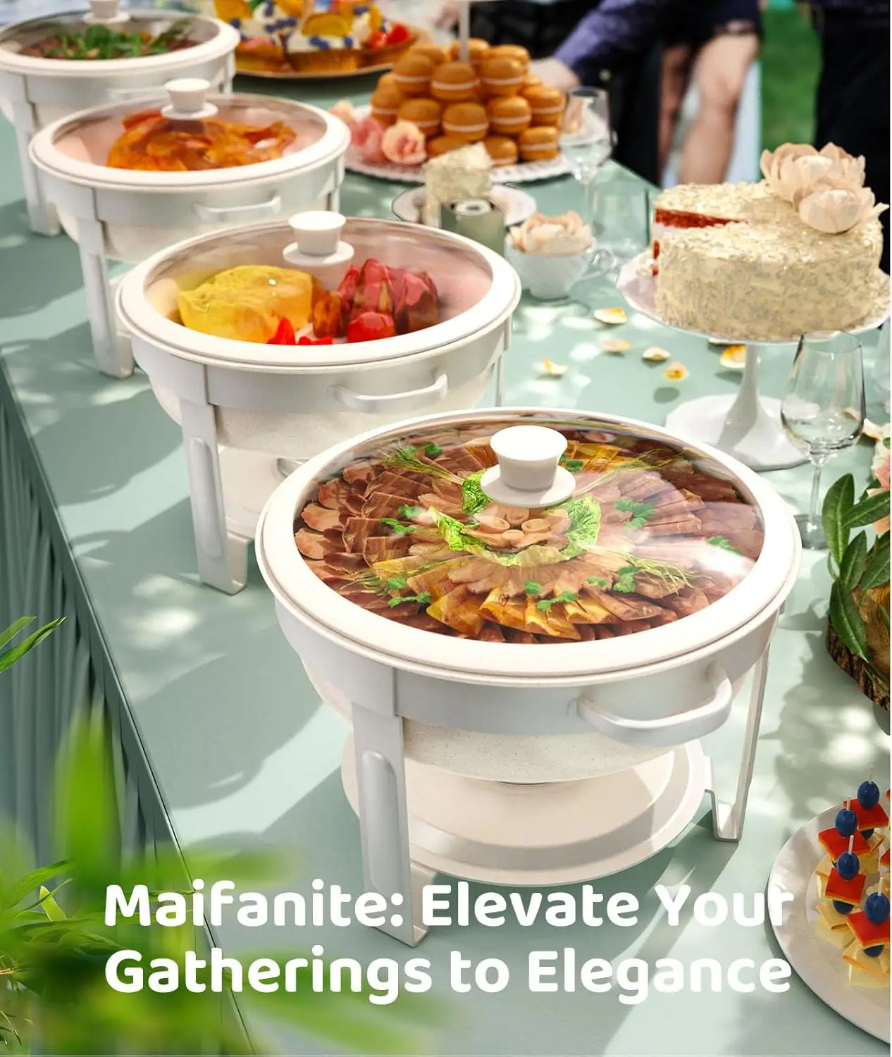 These chafing dishes are designed to keep food warm and ready for serving at any event. The set includes four complete units for large gatherings. Each dish features a durable construction suitable for repeated use. They maintain steady heat to keep meals fresh throughout service. The sleek design makes them ideal for professional catering. They are also perfect for home parties, buffets, and celebrations. The pans lift easily for refilling and cleaning. Their stable frames provide secure support during use. Each chafer helps present food in an elegant and organized way. The set enhances convenience when serving multiple dishes. It allows hosts to manage large meals effortlessly. These chafing dishes create a polished and efficient buffet setup.