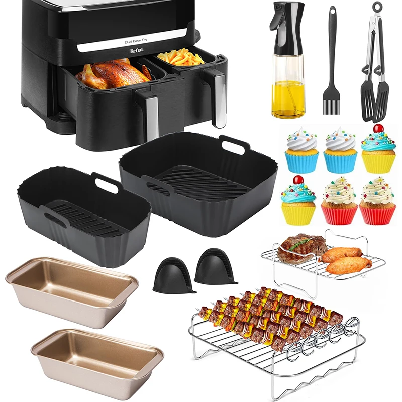 These air fryer accessories are designed for 5.2L and 3.1L dual zone baskets. The set includes silicone liners, baking racks, and oven trays for versatile cooking. Silicone liners are nonstick and easy to clean, preventing food from sticking. Baking and grill racks allow even air circulation for crispy, golden results. Perfect for baking, roasting, grilling, or reheating a variety of foods. Lightweight and durable, designed to fit most dual zone air fryer baskets. Makes cooking healthier by reducing the need for oil. Dishwasher-safe for convenient cleanup and repeated use. Helps keep your air fryer clean and prolongs appliance life. Ideal for cooking vegetables, chicken, seafood, and baked goods. Compatible with ovens as well, adding versatility to your kitchen. These air fryer accessories combine convenience, durability, and efficiency for everyday cooking tasks.