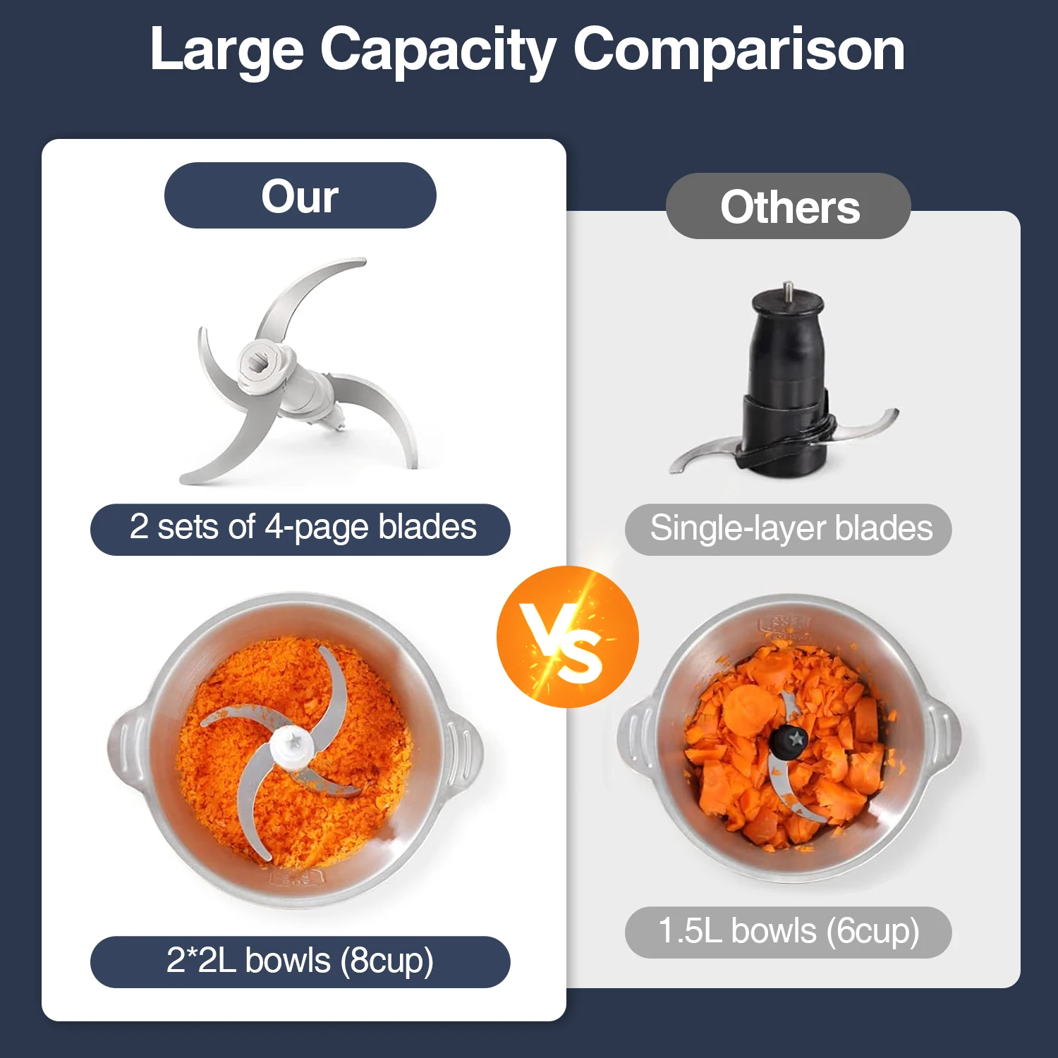This Electric Food Processor is designed to make meal prep faster and easier. It comes with two 8-cup bowls—one stainless steel and one glass—for versatile food processing options. The powerful motor delivers smooth performance for chopping, grinding, and mixing. With 2-speed control, you can adjust the texture for soft or hard ingredients. It efficiently handles vegetables, meat, nuts, herbs, and more. The sharp stainless steel blades ensure fast and consistent cutting. Both bowls are durable, food-safe, and easy to clean. A non-slip base keeps the unit stable while processing. The compact design makes it perfect for any home kitchen. It reduces prep time and helps create sauces, salads, fillings, and minced meat with ease. All detachable parts are simple to assemble and wash. This food chopper is an essential kitchen helper for everyday cooking.