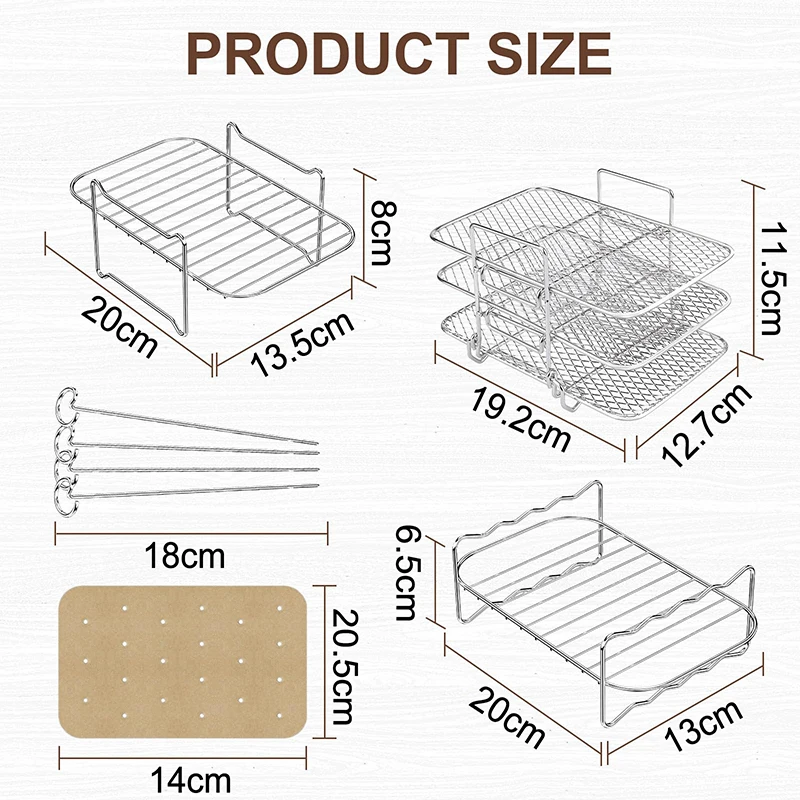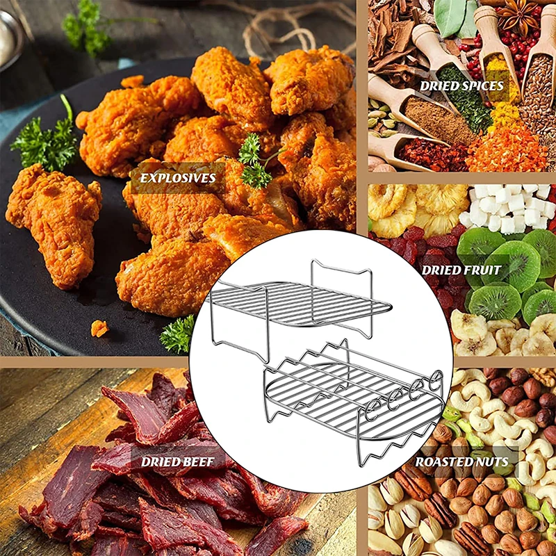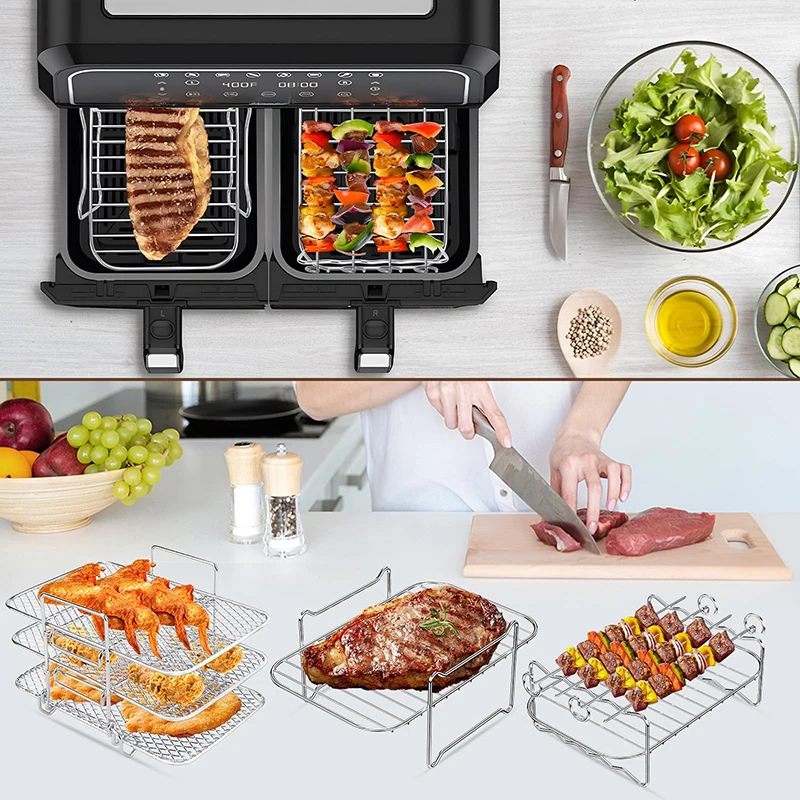This rectangle air fryer rack is designed for Ninja DZ201 and DZ401 double basket air fryers. It allows for even cooking and better airflow around your food. Ideal for grilling, baking, roasting, or reheating meals. The sturdy construction supports multiple foods at once without bending. Compatible with air fryer paper liners for easy cleanup. Perfect for cooking chicken, vegetables, seafood, and more. Lightweight and easy to insert or remove from the air fryer basket. Saves time by allowing multi-level cooking and more food per batch. Dishwasher-safe design makes cleaning convenient and effortless. Its rectangular shape fits perfectly in double basket air fryers. Helps achieve crispy, golden-brown results with minimal oil. This air fryer rack set combines convenience, versatility, and durability for all your air frying needs.